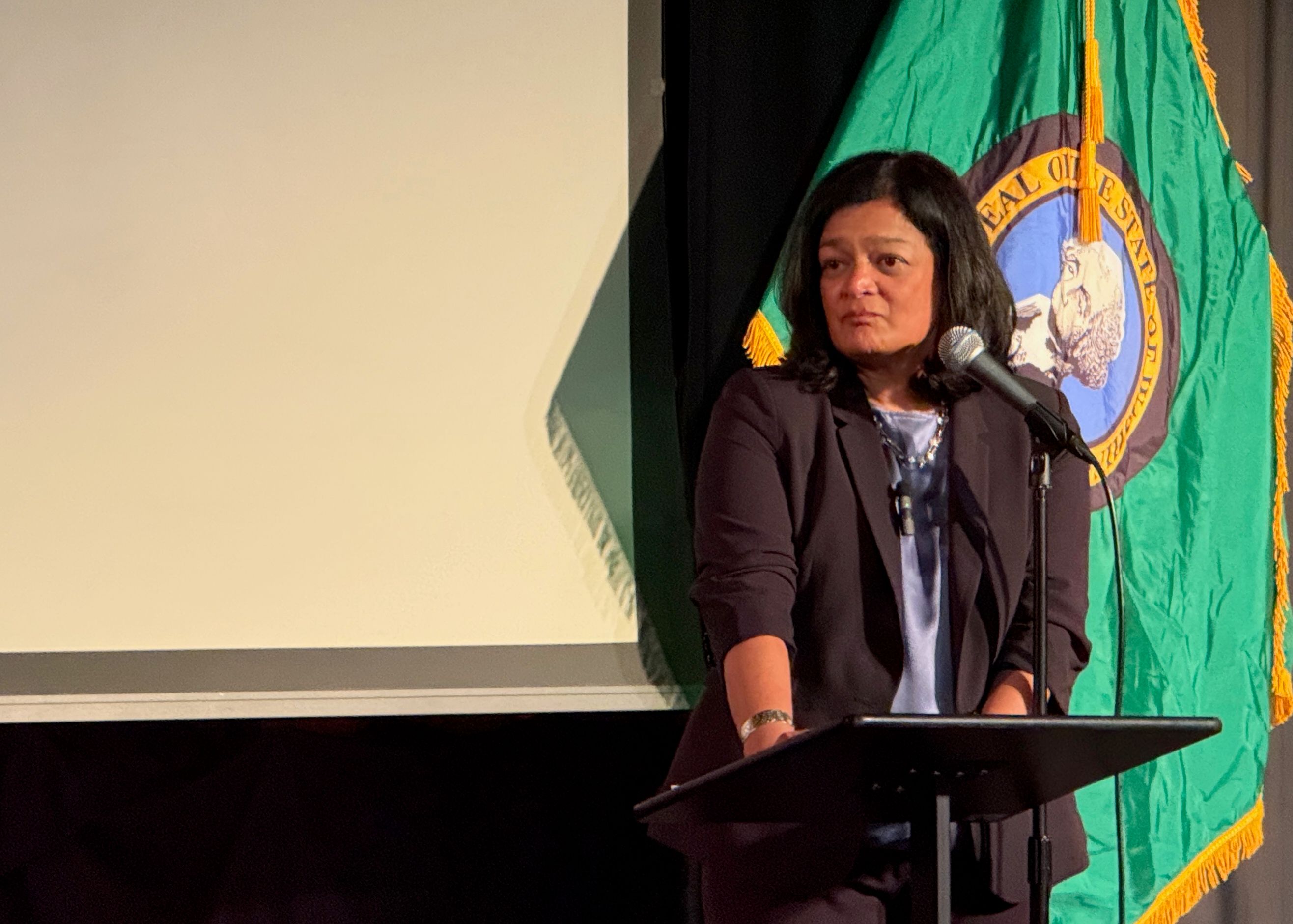 Congresswoman Pramila Jayapal takes constituent questions during a town hall event at Third Place Commons in Lake Forest Park on Feb. 18. (The Osprey/David Mendez)